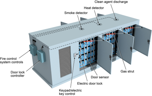 除了門鎖和控制器,該系統(tǒng)還包括來自火災報警面板、門傳感器、煙霧和熱量探測器的信號輸入,以及自動或手動開門的機制。NFPA855和《國際防火規(guī)范》要求對機柜采取防爆措施。IntelliVent是第一個設計用于滿足這些需求的系統(tǒng)。