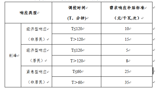 單次響應(yīng)量在申報響應(yīng)量的80%-120%之間,按照實際響應(yīng)量給予補償,單次實際響應(yīng)量超過申報響應(yīng)量的120%,按照申報響應(yīng)量的120%給予補償,單次實際響應(yīng)量低于申報響應(yīng)量80%的不享受補償。其中緊急性削峰需求響應(yīng)補貼最高35元/kW·次,經(jīng)濟性非居民需求響應(yīng)補貼最高15元/kW·次。