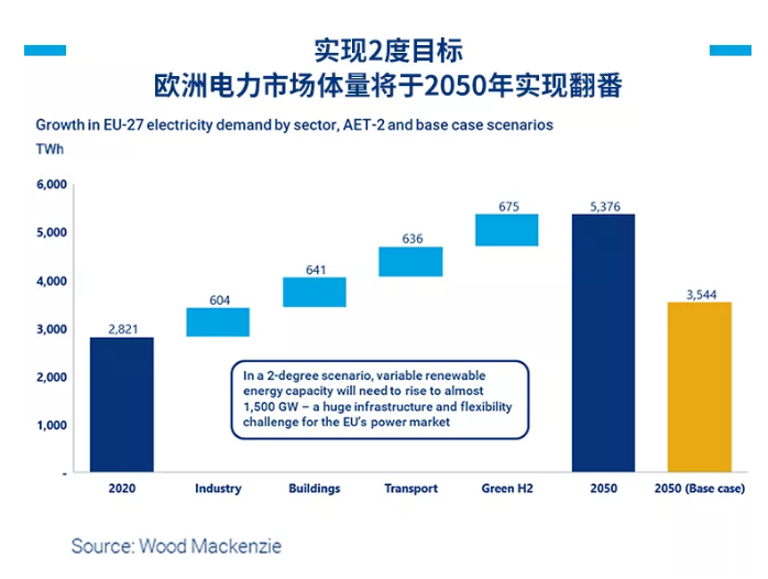 在AET-2場景中,到2050年前的電力需求基本需要翻倍,達到5,376TWh(基本預測數(shù)據(jù)為3,544TWh),具體如下圖所示。由于電動汽車充電、工業(yè)生產(chǎn)及民用采暖需求加大,大多數(shù)新增需求將由綠色氫能源滿足。
