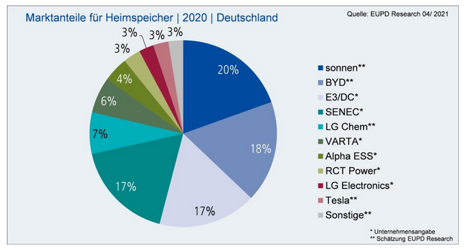 由于對住宅儲能系統(tǒng)的需求不斷增長,這意味著電池儲能供應商將會在進一步擴大銷售量。根據(jù)EUPD Research公司在2020年通過對住宅電池儲能制造商、安裝商和最終客戶的廣泛調(diào)查,Sonnen公司和比亞迪公司分別是行業(yè)領先的電池供應商,其市場份額分別為20%和18%。E3/DC和Senec排名第三,分別占17%??傮w而言,行業(yè)領先的制造商提供了所有部署的太陽能+電池儲能系統(tǒng)的72%。