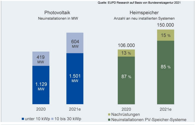 根據(jù)EUPD Research公司的預計,這一增長趨勢將在今年進一步持續(xù),而今年將部署的裝機容量為10kW以下住宅太陽能發(fā)電設施的總裝機容量為1.5GW。根據(jù)調(diào)查,德國2020年部署的住宅電池儲能系統(tǒng)總裝機容量達到創(chuàng)紀錄的1.1GW。分析師預測,今年部署的裝機容量為10kW到至30kW之間的住宅太陽能發(fā)電設施的總裝機容量將達600MW。
