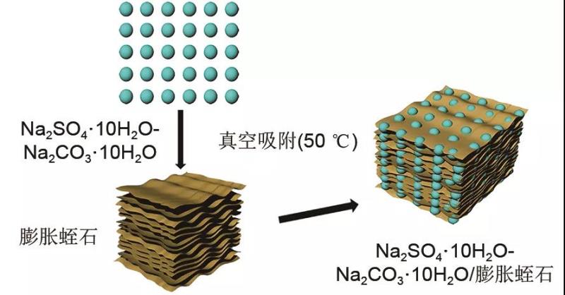 Xie等通過真空吸附法將50%Na2SO4·10H2O-50%Na2CO3·10H2O水合鹽與膨脹蛭石(EV)相結(jié)合,原理如圖2所示,解決了液體PCM的相分離和泄漏問題,確定水合鹽/EV復(fù)合相變材料的最大水合物百分比為60%。掃描電鏡、紅外光譜和X射線衍射結(jié)果表明,復(fù)合相變材料僅通過物理相互作用完全浸漬到EV的多層結(jié)構(gòu)中。熱重和熱循環(huán)試驗表明,復(fù)合PCM具有良好的熱穩(wěn)定性和可靠性。