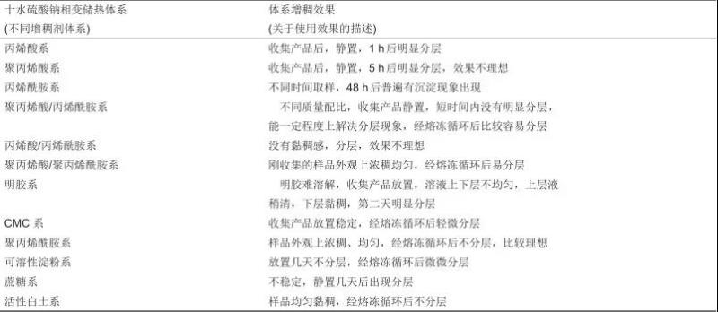 劉欣等制備了以SSD為主相變材料的相變體系,發(fā)現(xiàn)丙烯酰胺/丙烯酸共聚物體系、羧甲基纖維素體系、明膠體系的穩(wěn)定性依次減弱,即對于SSD相變材料而言,丙烯酰胺/丙烯酸共聚物是一種具有較好增稠效果的增稠劑。此外,劉欣探討了不同增稠劑對SSD相變體系儲熱能力的影響,如表2所示,發(fā)現(xiàn)丙烯酸系、聚丙烯酸系、丙烯酰胺系、聚丙烯酸/丙烯酰胺系、丙烯酸/丙烯酰胺系、聚丙烯酸/聚丙烯酰胺系、明膠系、CMC系、聚丙烯酰胺系、可溶性淀粉系、蔗糖系、活性白土系中,活性白土系和聚丙烯酰胺系比較均勻穩(wěn)定,CMC系和可溶性淀粉系經(jīng)熔凍循環(huán)后出現(xiàn)輕微分層,可在此基礎(chǔ)上添加一些其他助劑,提高相變體系的相變蓄熱能力和使用壽命。