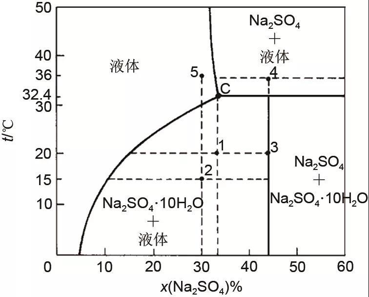 硫酸鈉和水體系的相圖(圖1)表明,十水硫酸鈉的相變溫度為32.4 ℃,高于此溫度,會產(chǎn)生無水硫酸鈉和其飽和溶液,低于此溫度,無水硫酸鈉被水化合生成Na2SO4·10H2O,但不完全溶解,導(dǎo)致分層,并有白色沉淀物析出,發(fā)生相分離[24-25]。