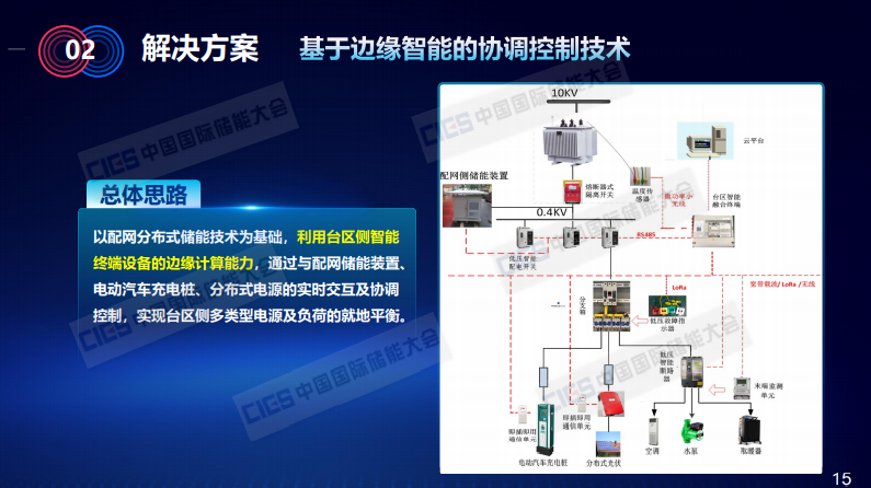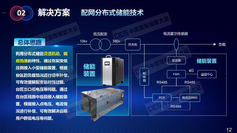 而儲(chǔ)能技術(shù)和物聯(lián)網(wǎng)技術(shù)的發(fā)展,為我們解決這兩個(gè)矛盾提出了一個(gè)新的思路,下面我們來介紹解決方案。第一,是我們剛才提到的配網(wǎng)側(cè)分布式儲(chǔ)能技術(shù)。總體思路如下,它主要是利用分布式儲(chǔ)能靈活機(jī)動(dòng)、響應(yīng)迅速的特性,通過在配電臺(tái)區(qū)380V的主線并聯(lián)接入儲(chǔ)能裝置,通過實(shí)時(shí)監(jiān)控臺(tái)區(qū)以及用戶側(cè)的負(fù)荷、電流、電壓等相關(guān)的負(fù)荷數(shù)據(jù),在系統(tǒng)有需要的進(jìn)行實(shí)時(shí)就地的功率補(bǔ)充,以此解決相應(yīng)的重過載問題。解決低電壓的問題,一般來說用戶低電壓是出現(xiàn)在臺(tái)區(qū)的末端,也就是380V主線后端位置,在這種情況下,我們會(huì)將儲(chǔ)能裝置并聯(lián)接入末端集中低電壓用戶群前面一點(diǎn)點(diǎn)的位置,通過監(jiān)測(cè)接入點(diǎn)的電壓、電流等相關(guān)數(shù)據(jù),進(jìn)行就地補(bǔ)充,以此減少主線上因?yàn)榇筘?fù)荷電流所產(chǎn)生的壓降,以此來解決負(fù)荷側(cè)的低電壓?jiǎn)栴},這點(diǎn)對(duì)于山區(qū)用戶是非常有效的。
