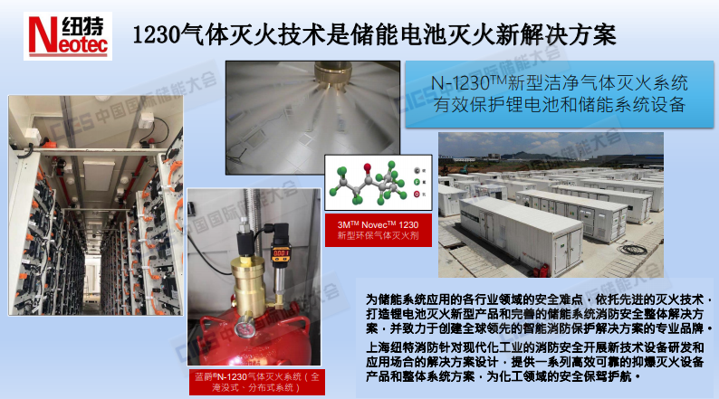 我們?cè)谘芯慨?dāng)中發(fā)現(xiàn)所有的滅火介質(zhì)里面,現(xiàn)在看來(lái)只有兩個(gè)介質(zhì)。因?yàn)閺难芯坷锩姘l(fā)現(xiàn)電池火很重要一點(diǎn)是要降低溫度,水是有效的,但是儲(chǔ)能里面用水是一個(gè)挑戰(zhàn),因?yàn)樗赡芤斐善渌挠绊?,我們后面?huì)專門(mén)提到細(xì)水霧的問(wèn)題。另外我們發(fā)現(xiàn)氣體里面最新的新型氣體NovecTM1230(全氟己酮),它是一個(gè)非常優(yōu)秀的滅火新技術(shù),這個(gè)技術(shù)平時(shí)看上去像液體,噴出來(lái)以后就產(chǎn)生氣體,它在電氣里面使用最有利。比如它有幾個(gè)友好的特點(diǎn):不導(dǎo)電、無(wú)腐蝕、無(wú)殘留、無(wú)損害,噴好以后,滅了火以后,最后什么也見(jiàn)不到。