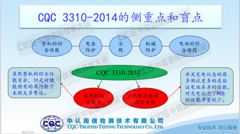新國(guó)標(biāo)的側(cè)重點(diǎn)和盲點(diǎn)。34120相當(dāng)于是一個(gè)要求,34133是一個(gè)執(zhí)行的方法,內(nèi)容上更加側(cè)重于整機(jī)的性能,包括并網(wǎng)綜合能力、安規(guī)、離網(wǎng)能力以及充放電的綜合性能。其實(shí)可以看出來(lái)兩個(gè)不同標(biāo)準(zhǔn)對(duì)比一下的話,它的側(cè)重點(diǎn)就能夠突出地表現(xiàn)出來(lái),就是更加注重并離網(wǎng)的綜合能力和充放電的綜合能力。但是我們的34120包括34133這兩個(gè)標(biāo)準(zhǔn)對(duì)于電池的綜合性能其實(shí)沒有更多的贅述,并沒有做更多的要求,因?yàn)槟悻F(xiàn)在電池其實(shí)有單獨(dú)的電池標(biāo)準(zhǔn)去對(duì)電池做要求,所以它在34120、34133里面沒有過(guò)多說(shuō)這方面的東西