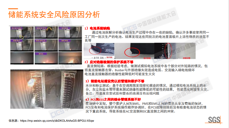 在標準里面對熱失控也有清晰的定義,像國標36276、IEC62619、UL1973、UL9540A都定義了單體電芯熱失控的定義,我們國標36276同時也定義了模組的級聯(lián)熱失控的定義。這是熱失控的整個過程,就是單體電芯從開始加熱到它析氣,一直到爆炸燃燒,最后燃燒結(jié)束,一共有五個階段,不再贅述。風(fēng)險原因分析:1.電池系統(tǒng)的缺陷。單體電芯在選的時候,一致性沒有選好,另外一個就是我們系統(tǒng)內(nèi)的保護邏輯沒有設(shè)計得非常完善;2.應(yīng)對絕緣檢測的保護系統(tǒng)不夠,有可能在整個系統(tǒng)里面會發(fā)生與外部絕緣失控,產(chǎn)生閃弧,造成短路;3.儲能電站建設(shè)完以后需要管理和維護;4.BMS、EMS之間的協(xié)調(diào)管控以及預(yù)警失效等問題也需要我們注意。