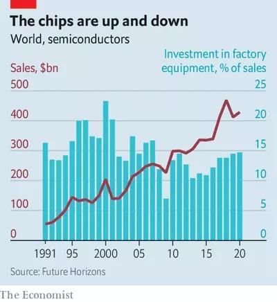 芯片行業(yè)咨詢公司Future Horizons的負責(zé)人馬爾科姆·佩恩(Malcolm Penn)說:“最重要的(要認識到的)一點是,短缺是這個行業(yè)的一個自然現(xiàn)象。”他說,芯片制造是經(jīng)濟學(xué)家所說的“豬肉周期”經(jīng)濟的一個很好的例子,以20世紀(jì)20年代美國豬肉市場首次分析的供應(yīng)不足和供應(yīng)過剩之間的規(guī)律性波動命名。與生豬一樣,芯片的供應(yīng)不能對需求的變化迅速做出反應(yīng)。佩恩表示,甚至在疫情大流行之前,芯片產(chǎn)能就很緊張。芯片制造商在工廠設(shè)備方面的投資多年來一直低于長期平均水平(見圖表)。