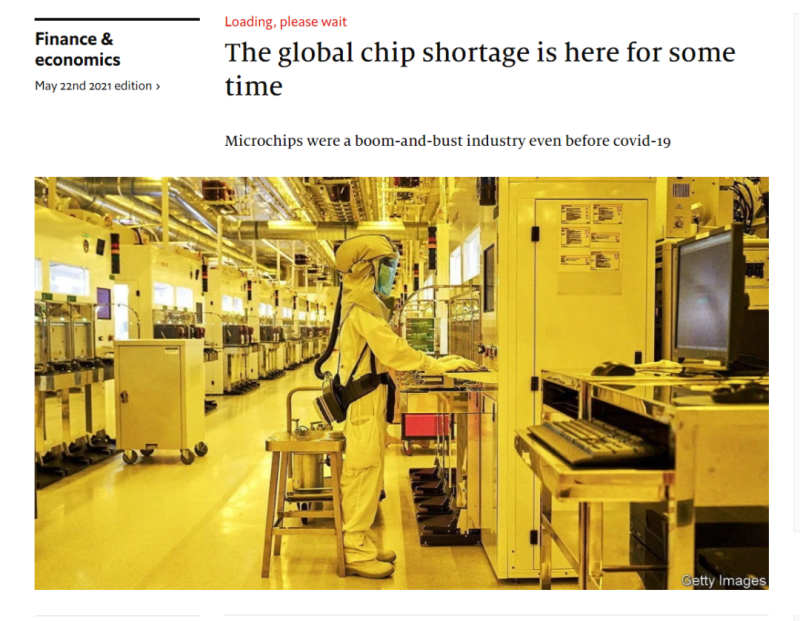 《經(jīng)濟學(xué)人》雜志發(fā)表文章,題目是:The global chip shortage is here for some time(全球芯片短缺將會持續(xù)一段時間)。