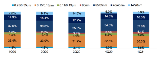 中芯國(guó)際2021年一季度各制程營(yíng)收占比