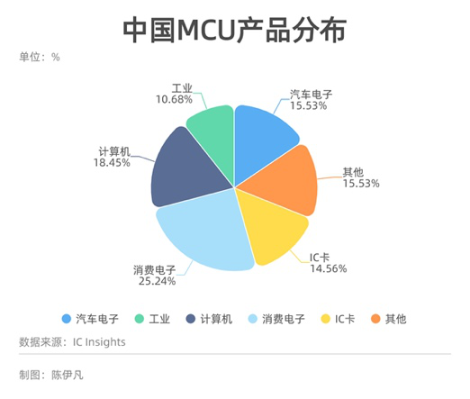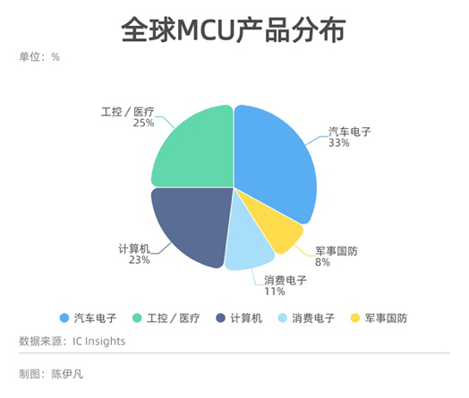 據(jù)第三方市場(chǎng)調(diào)研機(jī)構(gòu)IC Insights數(shù)據(jù),2019年全球MCU下游應(yīng)用主要分布在汽車電子,其次是工控/醫(yī)療領(lǐng)域、然后是計(jì)算機(jī)和消費(fèi)電子四大領(lǐng)域。而在中國(guó),MCU的應(yīng)用主要集中在家電等品類,消費(fèi)電子的占比最多,汽車電子的占比明顯低于全球的水平。
