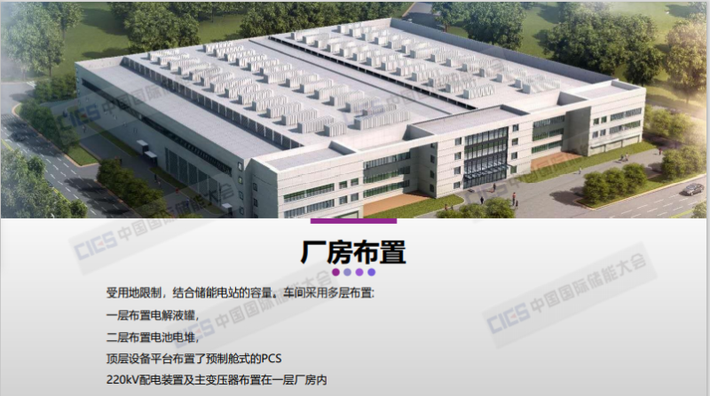 這張圖是這個電站的效果圖,實際建設(shè)的情況和它也相差不多,受到用地限制,因為是城市中心電站,用地是征地來的。所以我們采用了多層布置,一層布置電解液的液罐,二層布置液堆,在頂層設(shè)計了一個高的高鐵臺,用來布置PCS的集裝箱預(yù)制艙。220KV配電裝置和變壓器布置在一層廠房內(nèi),實現(xiàn)了和周邊環(huán)境的一致性。