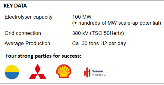 由漢堡燃?xì)夤荆h堡市政供暖企業(yè))與大瀑布電力公司(下稱Vattenfall)、殼牌和三菱重工攜手打造漢堡綠色氫能中心(項(xiàng)目1),計(jì)劃在德國(guó)漢堡建造一個(gè)擁有100MW容量電解槽的全球最大制氫工廠之一。該項(xiàng)目將利用風(fēng)能和太陽能生產(chǎn)綠色氫氣,而全球最大的國(guó)際風(fēng)能展就位于漢堡,逢雙年舉辦。據(jù)估,該工廠每小時(shí)可生產(chǎn)2噸氫氣,可供一輛氫能燃料電池汽車行駛20萬公里。