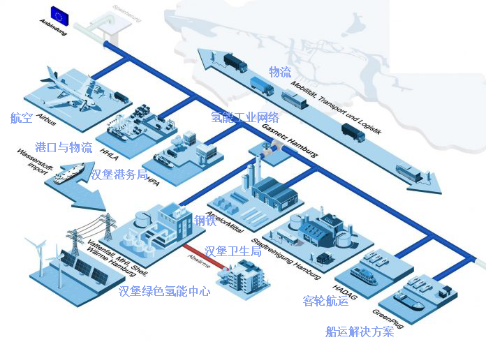漢堡港口和物流股份公司(HHLA)、漢堡港務(wù)局(HPA)、空中客車(Airbus)、安賽樂米塔爾(ArcelorMittal)、漢堡燃?xì)饩W(wǎng)絡(luò)公司(Gasnetz Hamburg)、GreenPlug以及漢堡城市清潔公司,聯(lián)合“漢堡綠色氫能中心”(由殼牌、大瀑布電力公司、三菱重工和漢堡燃?xì)夤窘M成),共同組建了“漢堡氫能網(wǎng)絡(luò)”(Hamburg Hydrogen Network),以促進(jìn)漢堡氫能塊區(qū)鋪設(shè)、聯(lián)動(dòng)發(fā)展、節(jié)能減排。