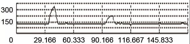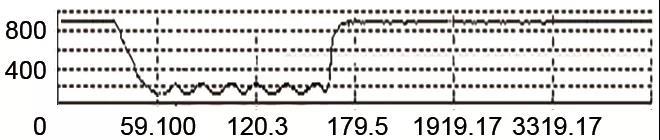 圖10的波形是正端竄入交流電壓后的情況,電壓出現(xiàn)下跌,并出現(xiàn)交流成分。時標(biāo)37.5 mS時竄入交流電壓,165.5 mS后交流竄入消失,電壓恢復(fù)正常。
