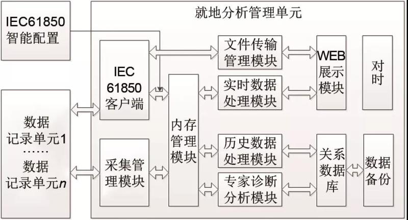 人機(jī)交互采用WEB方式展示波形和運行信息;數(shù)據(jù)庫保存儲能艙長期運行數(shù)據(jù),為專家診斷分析模塊提供數(shù)據(jù)支撐;采集管理模塊作為數(shù)據(jù)記錄單元信息接入接口。就地分析管理單元的框圖如圖7所示。