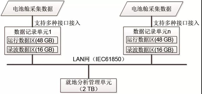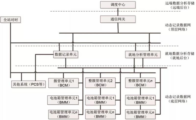 每個電池箱內(nèi)安裝電池箱管理單元(BMM),完成對箱體內(nèi)單體電池電壓和溫度的采集工作。若干個電池箱構(gòu)成一個電池簇,簇內(nèi)建立一個數(shù)據(jù)傳輸網(wǎng)絡(luò),簇內(nèi)信息由簇管理單元(BCM)管理,匯總簇單體電壓、溫度等信息,BCM同時完成簇端電壓、電流、絕緣的采集工作,形成對整簇電池的保護(hù)控制策略。多個電池簇并聯(lián)構(gòu)成一個電池堆,簇與簇之間采用另一個網(wǎng)絡(luò)進(jìn)行簇間信息傳輸。數(shù)據(jù)記錄單元接入到這兩個網(wǎng)絡(luò)中,并從中獲取所需數(shù)據(jù)。數(shù)據(jù)記錄單元通過接收PCS端的信息,用于獲取PCS的運行狀態(tài)。數(shù)據(jù)記錄單元的數(shù)據(jù)與就地分析管理單元和調(diào)度中心通過網(wǎng)絡(luò)進(jìn)行數(shù)據(jù)通信,全站對時系統(tǒng)對站內(nèi)設(shè)備進(jìn)行時間同步。