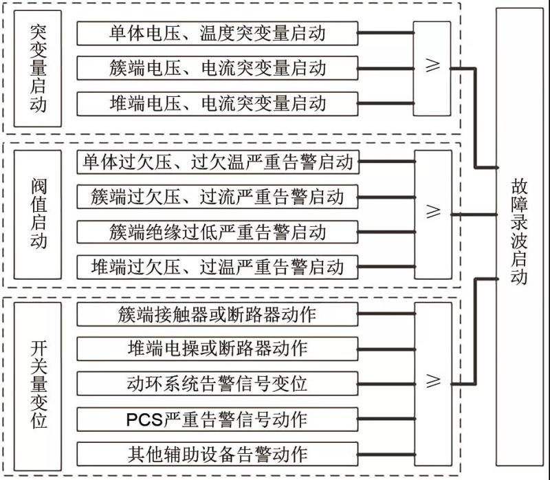 本系統(tǒng)覆蓋儲能艙內(nèi)各類故障及異常情況,啟動判據(jù)主要考慮以下幾種情況:單體電池電壓/溫度異常、電池簇端電壓/電流異常、電池堆端電壓/電流異常、儲能系統(tǒng)絕緣異常、消防動環(huán)告警、PCS告警、儲能艙內(nèi)各開關(guān)動作、充放電啟動等。本系統(tǒng)支持三種方式的故障錄波啟動判斷:突變量啟動、閥值啟動、開關(guān)量變化啟動,故障錄波啟動判斷邏輯見圖4。