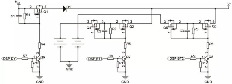 數(shù)據(jù)記錄單元具有自供電能力,能保障失電工況下設(shè)備持續(xù)正常運行。數(shù)據(jù)記錄單元采用2組鋰電池作為自備用電源,可持續(xù)自供電運行48 h,自備電源供電電路如圖3所示。外部供電時,Vout=8.0 V,用作裝置工作電源和鋰電池組的充電電源(鋰電池額定電壓為7.4 V)。當(dāng)外部失電時,Vout=0,鋰電池向裝置供電。考慮備用鋰電池電源不能長時間浮充,因此裝置通過軟件控制策略,平時旁路充電回路,定期維護(hù)鋰電池電源,切換開關(guān)采用MOS管,無切換次數(shù)限制。