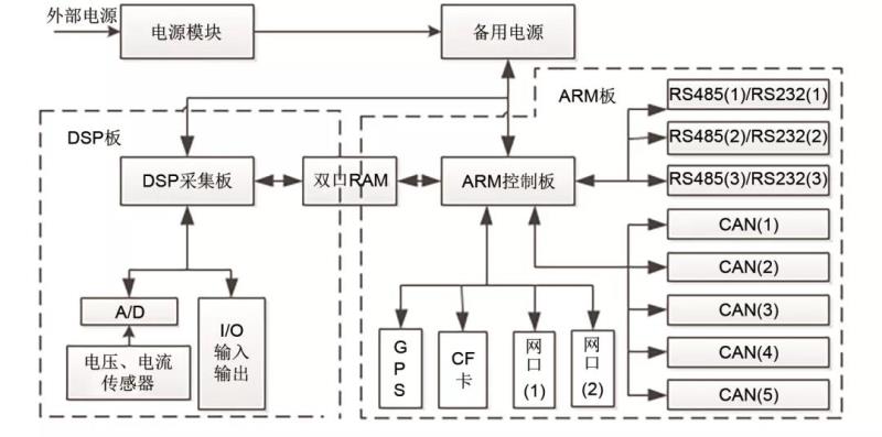 數(shù)據(jù)記錄單元由電流傳感器、電壓傳感器、AD調(diào)理電路、開關(guān)量采集電路、DSP數(shù)據(jù)采集板、ARM控制板,從接入信息的多樣性和通訊實時性考慮,數(shù)據(jù)記錄單元有多個通道的通訊接口。