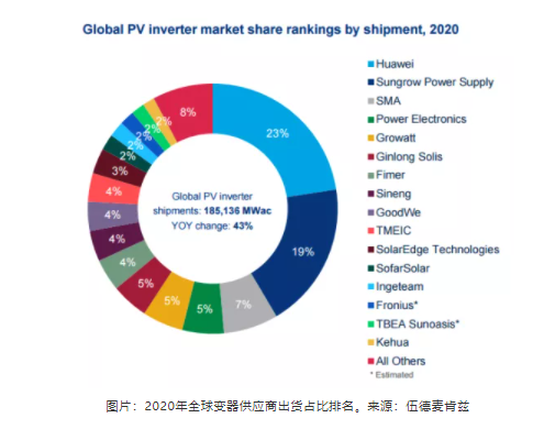 2020年,華為在全球的市場(chǎng)份額相對(duì)穩(wěn)定,保持在23%左右。陽(yáng)光電源的市場(chǎng)占比則提高到了19%。SMA的市場(chǎng)份額從2019年的8%略微下降到了2020年的7%,但仍舊以較大優(yōu)勢(shì)排在第三位。