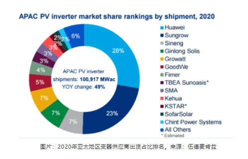 亞太地區(qū)很明顯成為了2020年最大的逆變器市場(chǎng),其100.92GW的出貨量與2019年相比增長(zhǎng)了近50%。其中僅中國(guó)就占了全球出貨量的約30%。此外,越南、印度市場(chǎng)均有不同程度的增長(zhǎng)。在這一市場(chǎng),出貨前十的供應(yīng)商中除了排在第七的Fimer和第九位的SMA以外,全部被中國(guó)品牌包攬。華為、陽(yáng)光電源、上能、錦浪、古瑞瓦特和固德威占據(jù)出貨前六名。僅華為和陽(yáng)光電源的出貨量占比就達(dá)到了亞太地區(qū)總量的51%。
