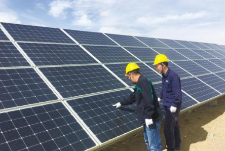 工作人員在檢查太陽能光伏板。