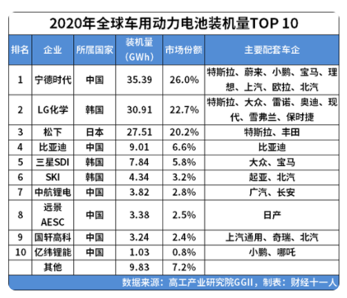 表1 :2020年全球車用動(dòng)力電池裝機(jī)量TOP10