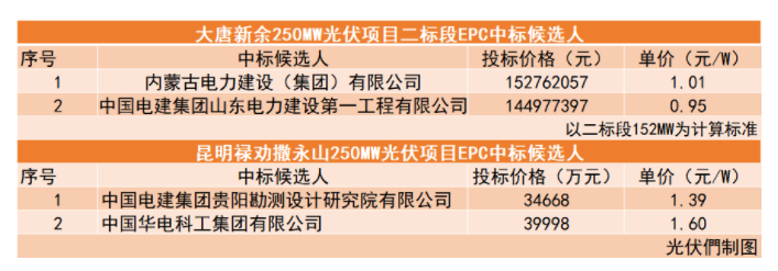 中國儲(chǔ)能網(wǎng)迅:6月18日,大唐新余250MW光伏項(xiàng)目二標(biāo)段與昆明祿勸撒永山250MW光伏項(xiàng)目兩個(gè)項(xiàng)目公布了EPC中標(biāo)候選人。內(nèi)蒙古電力建設(shè)(集團(tuán))有限公司以投標(biāo)總價(jià)152762057元,單價(jià)1.01元/W成為大唐新余250MW光伏項(xiàng)目二標(biāo)段的第一中標(biāo)候選人;中國電建集團(tuán)貴陽勘測設(shè)計(jì)研究院有限公司則以投標(biāo)價(jià)格34668萬元,單價(jià)1.39元/W位列昆明祿勸撒永山250MW光伏項(xiàng)目的第一中標(biāo)候選人。