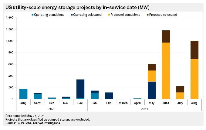 S&P Global Market Intelligence的數(shù)據(jù)顯示,如果開發(fā)商和公用事業(yè)公司的計(jì)劃獲得成功,截至今年8月份,美國(guó)公用事業(yè)規(guī)模的儲(chǔ)能總裝機(jī)容量(不包括常規(guī)抽水蓄能電站)同比增長(zhǎng)185%,至5582MW。