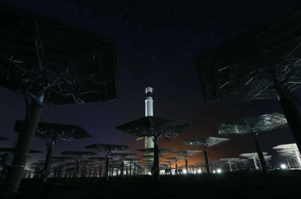 吸熱塔中的熔鹽吸收熱量,將約300℃的熔鹽加熱成560℃的高溫熔鹽,再經(jīng)過熱能交換產(chǎn)生高溫高壓蒸汽,推動汽輪發(fā)電機發(fā)電。整個項目配置了13小時儲熱系統(tǒng),能夠確保機組24小時連續(xù)、穩(wěn)定地運行。同時由于采用熔鹽作為儲熱介質,可以滿足電網(wǎng)需要,隨時進行負荷調(diào)整。相比傳統(tǒng)發(fā)電,光熱發(fā)電最大優(yōu)勢是能夠將熱能儲存,熔鹽的余溫可以在夜間繼續(xù)推動發(fā)電,實現(xiàn)24小時持續(xù)發(fā)電,就像“蓄電池”,白天充電,晚上放電,同時也不受云層干擾。