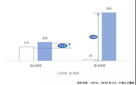 圖 2 2020-2030年全球抽水蓄能和電池儲能累計裝機規(guī)模(單位:GW)