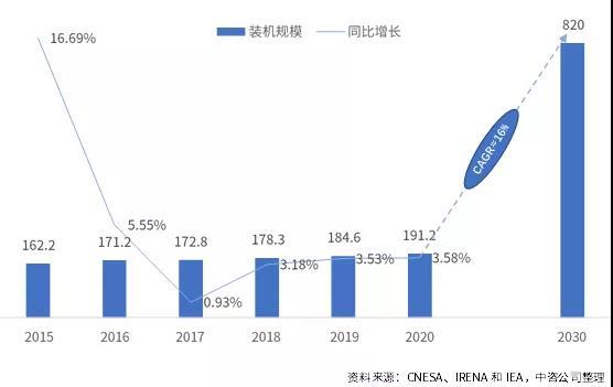 電池儲能將成為儲能新增裝機的重要來源和未來儲能的主要裝機支撐。截至2020年底,全球儲能已投運項目累計裝機規(guī)模為191GW,其中抽水蓄能裝機規(guī)模為172GW,占比90%,電池儲能裝機15GW,抽水蓄能占據(jù)絕對主導地位。根據(jù)IRENA和IEA預測的抽水蓄能和電池儲能裝機情況,到2030年,抽水蓄能裝機增加至230GW,2020~2030年復合增長率約3%,電池儲能裝機增加至590GW,2020~2030年復合增長率約44%。據(jù)此推算,到2030年,抽水蓄能裝機與電池儲能裝機比例約為1:2.5,電池儲能占比超過70%,成為未來儲能重要支撐性裝機來源。