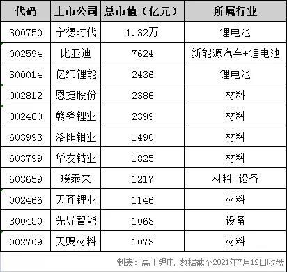 目前,鋰電板塊市值超千億的上市公司達到11家,其中涵蓋鋰電池業(yè)務的上市公司3家,涉及鋰電上游材料的上市公司7家,鋰電設備概念上市公司1家。