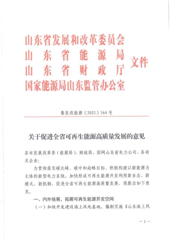今日(7月16日)上午,山東省能源局發(fā)布了《關于促進全省可再生能源高質(zhì)量發(fā)展的意見》,意見提到,為貫徹落實碳達峰、碳中和戰(zhàn)略目標,積極構建以新能源為主體的新型電力系統(tǒng),加快形成可再生能源開發(fā)利用新業(yè)態(tài)、新模式、新機制,促進全省可再生能源高質(zhì)量發(fā)展,提出一系列意見。