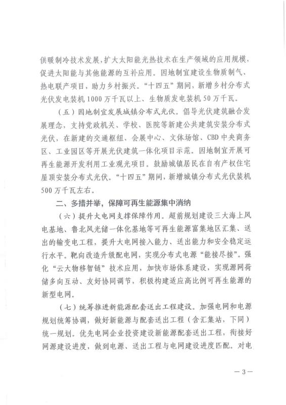具體包括:到2025年,(風)光儲一體化基地在建在運裝機容量達到2000萬千瓦左右;“十四五”期間,新增分布式光伏裝機量1500萬千瓦以上,其中鄉(xiāng)村分布式光伏發(fā)電裝機1000萬千瓦以上、生物質(zhì)發(fā)電裝機50萬千瓦,新增城鎮(zhèn)分布式光伏裝機500萬千瓦左右。