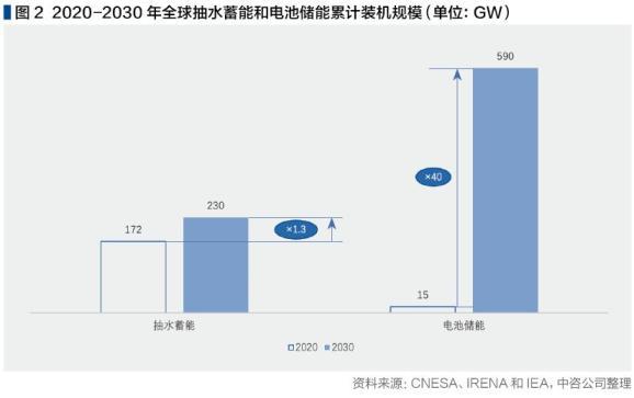 電池儲(chǔ)能將成為儲(chǔ)能新增裝機(jī)的重要來源和未來儲(chǔ)能的主要裝機(jī)支撐。截至2020年底,全球儲(chǔ)能已投運(yùn)項(xiàng)目累計(jì)裝機(jī)規(guī)模為191GW,其中抽水蓄能裝機(jī)規(guī)模為172GW,占比90%,電池儲(chǔ)能裝機(jī)15GW,抽水蓄能占據(jù)絕對主導(dǎo)地位。根據(jù)IRENA和IEA預(yù)測的抽水蓄能和電池儲(chǔ)能裝機(jī)情況,到2030年,抽水蓄能裝機(jī)增加至230GW,2020~2030年復(fù)合增長率約3%,電池儲(chǔ)能裝機(jī)增加至590GW,2020~2030年復(fù)合增長率約44%。據(jù)此推算,到2030年,抽水蓄能裝機(jī)與電池儲(chǔ)能裝機(jī)比例約為1:2.5,電池儲(chǔ)能占比超過70%,成為未來儲(chǔ)能重要支撐性裝機(jī)來源。