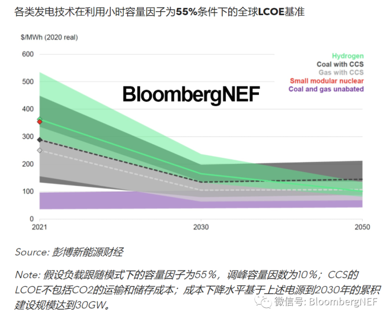 如今,太陽能和風(fēng)能已經(jīng)成為電網(wǎng)脫碳的支柱。彭博新能源財(cái)經(jīng)的分析顯示,在電池的配合下,此類清潔能源發(fā)電容量有潛力幫助實(shí)現(xiàn)總發(fā)電量的70-80%脫碳。然而,對于有志于實(shí)現(xiàn)接近凈零排放的國家來說,這還不夠。因此,各類使用低碳技術(shù)的可調(diào)度電源開始登上舞臺(tái),以滿足清潔能源不足時(shí)的用電需求。本文從成本競爭力的角度對該領(lǐng)域中的三位“種子選手”進(jìn)行了對比:氫能(hydrogen)、碳捕獲和封存(CCS)以及小型模塊化核反應(yīng)堆(SMR)技術(shù)。