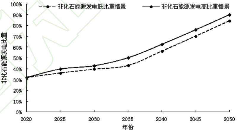 結(jié)合非化石能源消費比重情景設(shè)定以及一次能源電能轉(zhuǎn)化比重的趨勢,可以研判非化石能源發(fā)電比重。與非化石能源消費高比重和低比重兩種情景相對應(yīng)的,存在非化石能源發(fā)電高比重與低比重兩種情景。如圖3所示,未來三十年,非化石能源發(fā)電量占總發(fā)電量的比重將持續(xù)提升,到2050年,如果一次能源中非化石能源消費比重達到75%-80%,則非化石能源發(fā)電量比重將高達84%-90%。非化石能源在成為一次能源供應(yīng)主體的同時也將成為電力供給的主力軍,電力系統(tǒng)將呈現(xiàn)深度低碳化特征。