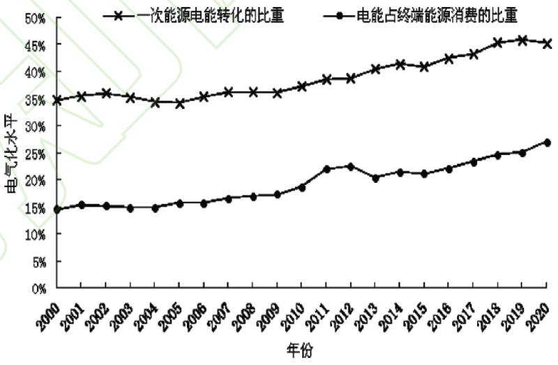 過去二十年間,隨著經(jīng)濟社會快速發(fā)展、城市化進程加速和科技水平不斷進步,中國的電氣化水平穩(wěn)步提升。電氣化水平在能源生產(chǎn)側(cè)主要體現(xiàn)為一次能源通過電能轉(zhuǎn)化的比重,即一次能源用于發(fā)電的比重,在消費側(cè)主要體現(xiàn)為電能占終端能源消費的比重。如圖1所示:在生產(chǎn)側(cè),一次能源電能轉(zhuǎn)化的比重從2000年的35%左右逐步提高到2020年的45%左右;在消費側(cè),電能占終端能源消費的比重從2000年的不到15%逐步提高到2020年的27%左右。近年來,在能源革命戰(zhàn)略引領(lǐng)下,可再生能源的發(fā)展和終端電能替代取得了較快進展,電氣化水平提升較快。