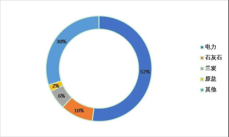 塑料產(chǎn)品按品類可劃分為聚丙烯(PP)、聚乙烯(PE)和聚氯乙烯(PVC)。我國(guó)的PVC工業(yè)是電力密集型的,主要有電石法和乙烯法這兩種制備工藝。受限于富煤、貧油、少氣的資源條件,我國(guó)主要以電石法生產(chǎn)PVC。電石法在生產(chǎn)PVC和焦炭制備電石時(shí)都需要耗費(fèi)電力,生產(chǎn)1噸PVC合計(jì)消耗電能約5450-5650 kWh,電力成本占總成本的52%左右,如圖10所示。