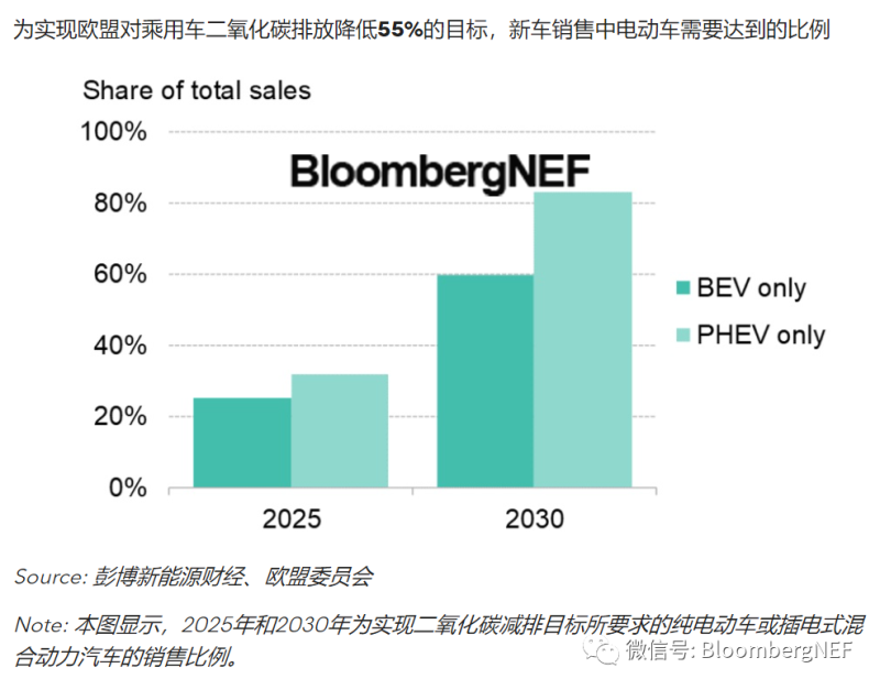 為實(shí)現(xiàn)歐盟2030年二氧化碳排放目標(biāo),純電動(dòng)車(BEV)在汽車銷售中需要達(dá)到的比例