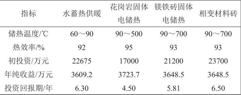 國外對高溫固體電儲熱技術的研究始于20世紀70年代,到80年代初,歐洲部分發(fā)達國家已開始進行實際應用。Sorour[15]對高溫固體電儲熱器進行了優(yōu)化設計,發(fā)現(xiàn)蓄熱材料大小、高度、換熱流體流量以及輸入熱量是影響蓄熱性能的主要參數(shù)。Laing等[16]開發(fā)了高溫混凝土蓄熱示范模塊,驗證了模塊在500 ℃的穩(wěn)定性以及200~500 ℃環(huán)境中長期儲熱的損耗。我國在高溫固體電儲熱技術應用已達到國際領先水平,但是目前研究多為應用形式的設計和經(jīng)濟性的分析,對于技術涉及的傳熱傳質過程等基礎研究缺乏深入的探討。劉曉東[17]設計了一種固體電儲熱供暖裝置,利用氧化鎂磚和熱管組成封閉的儲熱單元,降低氧化鎂磚固體的氧化速度。朱建新[18]提出了一種帶預制固體熱能存儲裝置的供熱系統(tǒng),利用金屬傘裙把固體儲熱材料分段,減小大范圍開裂損壞的危險。葛維春等[19]針對固體電制熱儲熱供暖機組,利用室內溫度需求、建筑物耗熱量、建筑物熱指標、采暖季熱負荷、儲熱機組加熱功率與蓄熱量等5個指標提出一種經(jīng)濟性配置方法。苗常海等[20]通過臨界電價法分析水儲熱、高溫固體儲熱、市政供暖技術、相變電儲熱技術的經(jīng)濟性,發(fā)現(xiàn)水儲熱、高溫固體儲熱技術相比市政供暖更具經(jīng)濟可行性,且前者的經(jīng)濟性最好。曲弘等[21]驗證了高溫固體電儲熱供暖技術對于實行峰谷電價地區(qū)的非居民項目具有顯著的經(jīng)濟效益。陳彬等[22]分析了高溫固體電儲熱供暖技術不僅具有一定的經(jīng)濟效益,更可產(chǎn)生環(huán)境效益,增大低谷段的風電和核電等清潔能源消納能力。表6為北京某供暖面積200萬m2電蓄熱方案經(jīng)濟性對比[23],從表中可以看出高溫固體電儲熱技術的經(jīng)濟性優(yōu)于水儲熱技術,且采用花崗巖為固體儲熱介質的經(jīng)濟性明顯好于以鎂鐵磚為固體儲熱介質。