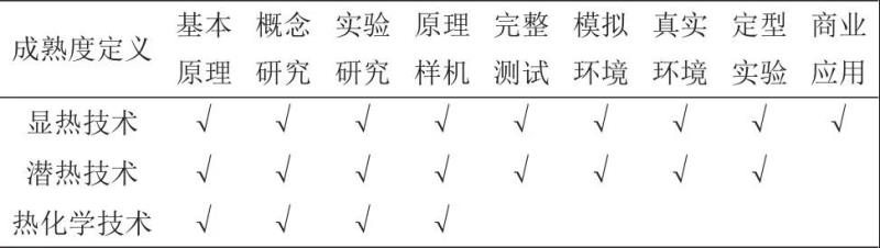 整體而言,不同的儲熱技術特點和技術成熟度見表3和表4。從表中可以看出,顯熱儲熱技術在儲熱規(guī)模、效率、壽命、成本、技術成熟度等方面具有較大的優(yōu)勢,但是儲能周期較短、能量密度較低等方面也限制了其應用發(fā)展,特別是一些儲熱體積限制較大的應用場合。潛熱儲熱技術具有較長的儲能周期、較大的能量密度、較高的熱效率和較長的使用壽命,但是其儲能規(guī)模和成本仍需要進一步改善,其技術成熟度也需要進一步提高,以達到商業(yè)應用的要求。熱化學儲熱技術在儲熱周期、能量密度等方面具有較大的優(yōu)勢,但是儲能規(guī)模、效率、壽命、成本、技術成熟度需要進一步改善,且相關研究仍處于實驗室驗證階段,需要大量的時間和經(jīng)費進行基礎研究以推進實際應用。