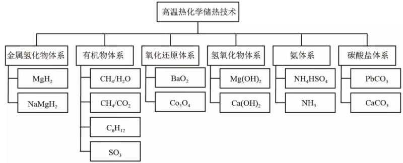 按照工作溫度,熱化學儲熱材料可分為中低溫熱化學儲熱材料和高溫熱化學儲熱材料。其中,中低溫熱化學儲熱材料主要是利用水蒸氣、氨氣作為吸收劑和吸附劑,常見的材料體系見圖3。高溫熱化學儲熱材料可以分為金屬氫化物體系、有機物體系、氧化還原體系、氫氧化物體系、氨體系和碳酸鹽體系,常見的材料見圖4。