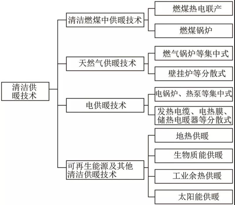 根據(jù)能源種類,清潔供暖技術可以分為清潔燃煤集中供暖技術、天然氣供暖技術、電供暖技術、可再生能源及其他清潔供暖技術,見圖1。