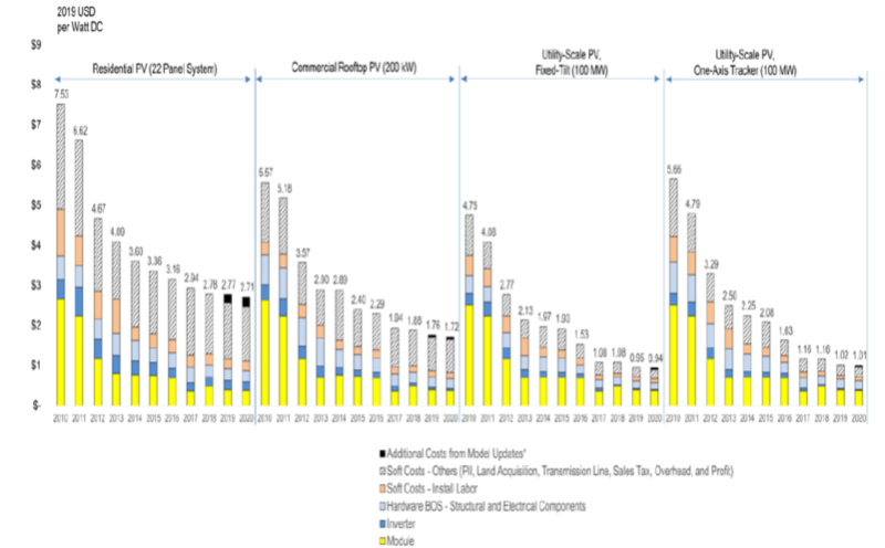 采用的基準(zhǔn)測試方法包括自下而上地計(jì)算安裝住宅、商業(yè)和公用事業(yè)規(guī)模太陽能發(fā)電系統(tǒng)時產(chǎn)生的系統(tǒng)和項(xiàng)目所有必要的開發(fā)成本,并對2019年第一季度和2020年第一季度的成本進(jìn)行了建模,其中并不包括任何先前的供應(yīng)協(xié)議或合同。