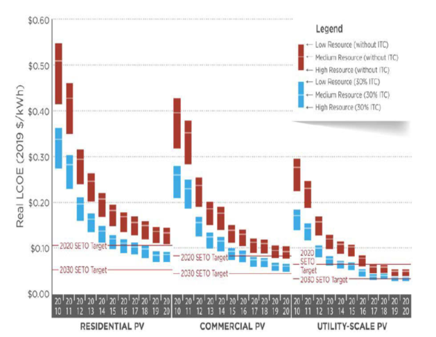 總投資成本的降低,以及運(yùn)營、系統(tǒng)設(shè)計(jì)和技術(shù)的改進(jìn),已經(jīng)導(dǎo)致電力成本的顯著降低。美國的住宅和商業(yè)太陽能發(fā)電系統(tǒng)在實(shí)現(xiàn)電力供應(yīng)社會成本(SETO)2020年電價目標(biāo)的過程中分別完成了93%和97%,而美國的公用事業(yè)規(guī)模太陽能電系統(tǒng)提前三年實(shí)現(xiàn)了目標(biāo)。