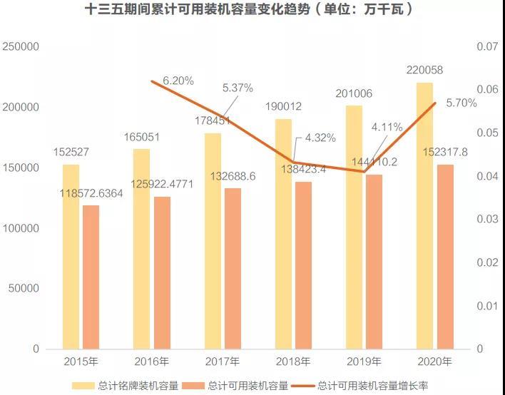 如果以火電、風(fēng)光的可用裝機容量來計算,“十三五”期間我國年均發(fā)電裝機容量的增長率只有4.87%。這就遠低于同期的全社會用電量增速(6.1%)和最大用電負荷增速(7.2%)。
